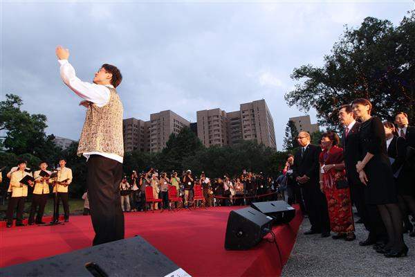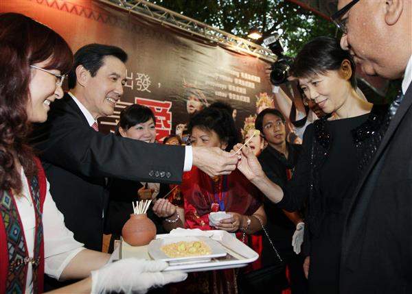 馬英九總統伉儷下午出席在臺北賓館舉辦的「中華民國101年國慶酒會」,與出席的中外貴賓親切寒暄致意,並參觀各式臺灣小吃美食攤、觀賞精緻冰雕作品。總統並與馬紹爾群島共和國總統羅亞克一起「搗」麻糬,並為羅亞克總統戴上排灣族之「豐收之珠」。隨後,總統也與現場貴賓一同觀賞「拉縴人男聲合唱團」及「屏東泰武國小古謠傳唱隊」之精彩表演。