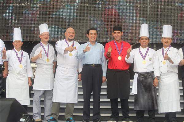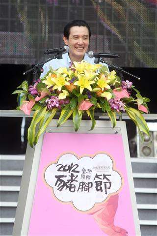 馬英九總統下午偕同行政院農委會主委陳保基南下屏東縣屏東市參加「2012臺灣國際豬腳節」開幕典禮,除頒發國際主廚獎牌,也現場品嚐豬腳小吃,親自體驗臺灣豬腳料理的特有美味。