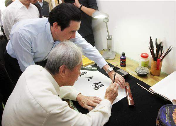 趙老先生亦當場揮毫,以特殊的鳥蟲體寫下「為民造福」墨寶贈予總統,總統則回贈「高齡碩士、不老樂活」,並祝福趙老先生不只要「呷百二」,還要「呷二百」。
