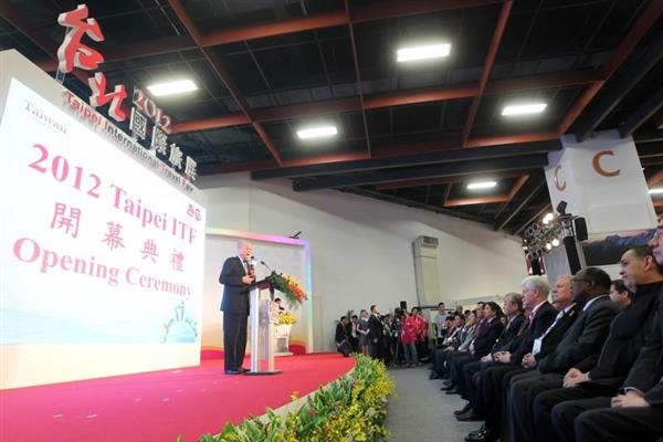 吳敦義副總統上午前往臺北世貿展覽館出席「2012年臺北國際旅展」開幕典禮,並期勉參展各界協力推廣臺灣觀光產業邁向「十全十美」的觀光世紀。