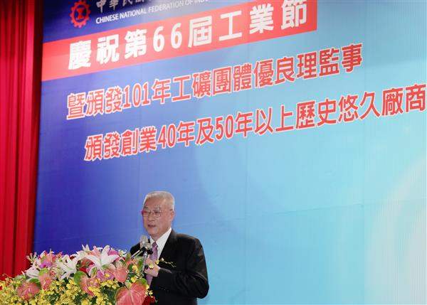 吳敦義副總統下午出席「第66屆工業節慶祝大會」,除肯定與會者為臺灣工業界所付出的努力與貢獻,並以「日進斗金賺大錢、守法重義繳稅多、善待員工闔家樂、節能減碳愛臺灣」期許與會的工業界代表。
