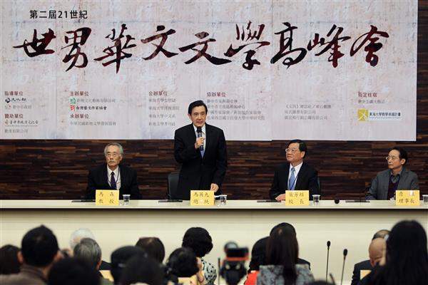 馬英九總統上午前往臺中市東海大學岀席「第二屆21世紀世界華文文學高峰會議」開幕式,期許該項會議能增加華文作家的交流與團結,讓華文創作在世界文學地位上持續向前邁進。