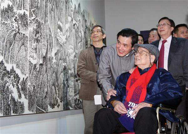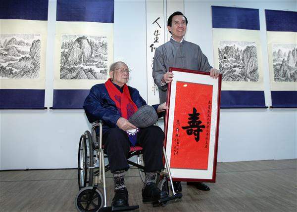 馬英九總統下午前往「中華文化總會」出席「年華若夢,人生似錦-張光賓先生世紀書畫展」開幕式,除肯定渠提攜後進不遺餘力,並致贈親筆題字之壽屏,以祝賀渠99歲高壽。