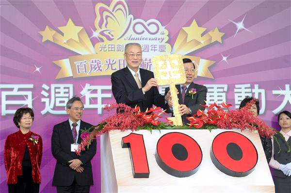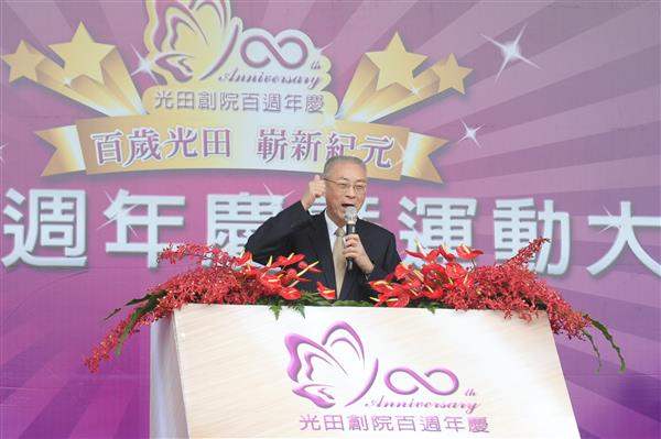 吳敦義副總統上午前往臺中市沙鹿區「弘光科技大學」出席「光田綜合醫院」創院百週年院慶,推崇該院是歷經三代傳承迄今的百年醫院,並期勉繼續「光大愛心、廣播福田」,秉持「篤實、關懷、倫理、卓越」的核心價值,開創更光輝燦爛的下一個一百年歷史。