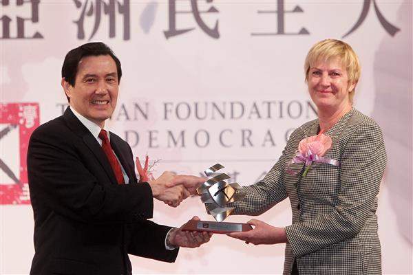 今天是「世界人權日」,馬英九總統上午出席「臺灣民主基金會」舉辦的「2012年第7屆亞洲民主人權獎」頒獎典禮,親頒獎座予「國際終止童妓組織」(ECPAT International)主席莫琳克朗比(Maureen Crombie),以表彰該組織對維護孩童人權的卓越貢獻。