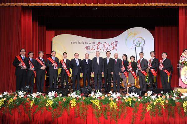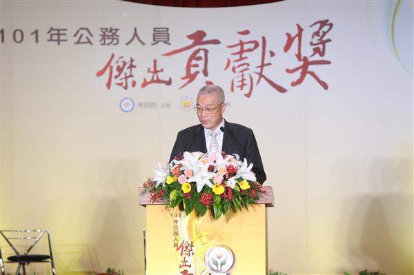 吳敦義副總統下午出席由考試院舉辦的「101年公務人員傑出貢獻獎」表揚大會,親自頒獎予10位模範公務人員,以肯定獲獎者對國家社會所做的貢獻,並期勉渠等繼續在工作崗位發揮潛能,、追求卓越績效,加強為民服務。