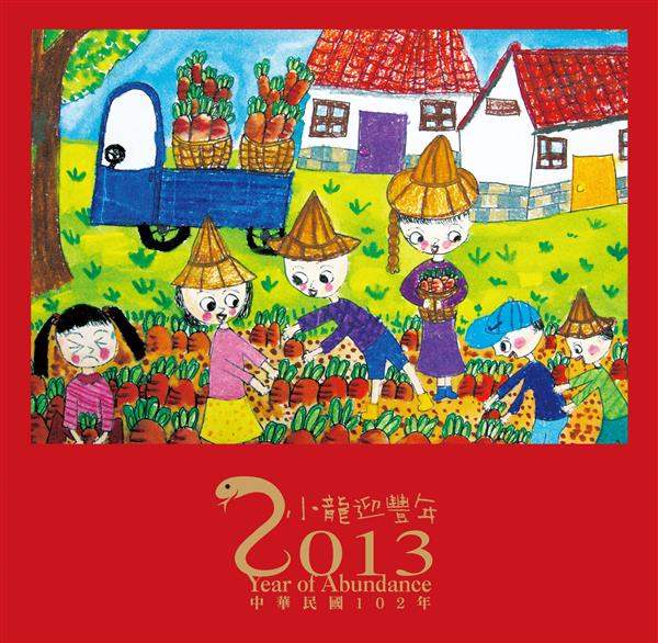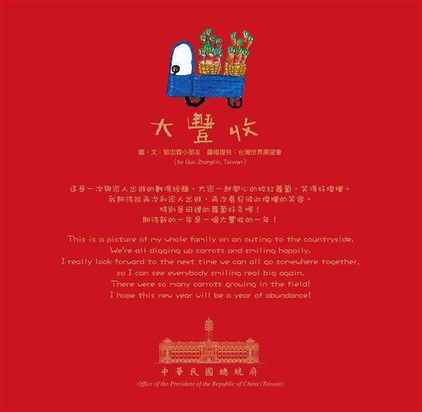 馬英九總統伉儷的賀年卡係以「小龍迎豐年」為主題,採用「臺灣世界展望會」提供之兒童畫作為主要素材,透過郭忠霖小朋友的作品,以及他純真言語所描繪全家攜手耕作、一起拔蘿蔔的景況,讓一家人合作、歡喜豐收的愉悅心情躍然紙上。蘿蔔又稱「菜頭」,與「彩頭」諧音,常做為祝福好運的吉祥物,總統伉儷衷心祝願大家在新的一年都能博得「好彩頭」,並盼心手相連,一同迎接豐收的小龍年。