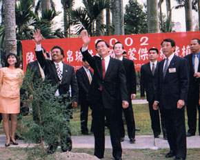 陳總統和雷蒙傑索總統一行人約於下午二時卅分抵達景美女中,受到黃郁宜校長和全體師生熱烈的歡迎。隨後兩國元首並共同植樹,種下一棵台灣肖楠,做為此行的紀念。
