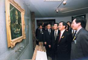 陳總統水扁先生今天下午出席在總統府南苑所舉行的「第六屆二二八美展」揭幕式,總統除了與受難者家屬相互配戴象徵「人與人之間彼此信任與關愛」的「百合緞帶」,及接受「二二八紀念碑」設計者鄭自財先生致贈「二二八紀念碑」的縮小模型外,也與受難者家屬一同參觀在總統府藝廊展出的二二八美展。