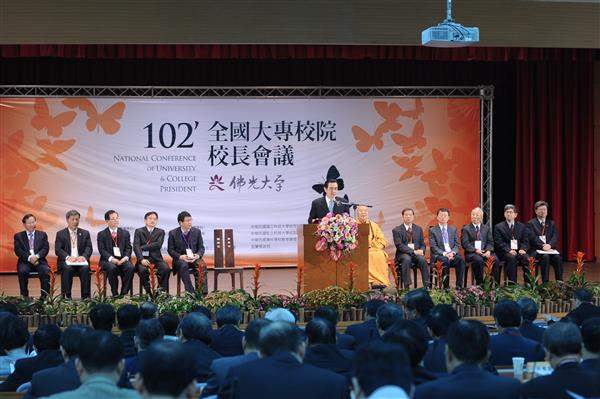 馬英九總統上午前往佛光大學出席「102年全國大專校院校長會議」,除肯定與會校長及嘉賓對教育工作的辛勤付出,並期許透過今日會議的相互交流,共同擘劃更完善的高等教育願景,再創我國教育事業發展高峰。