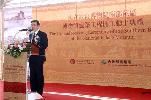 馬英九總統上午前往嘉義縣太保市出席「國立故宮博物院南部院區開工典禮」,除說明政府選擇嘉義縣興建故宮南院,係為使國民文化權分配更為均衡,並保證未來故宮本院文物一定會至南院展出。
