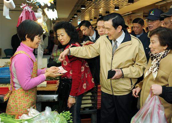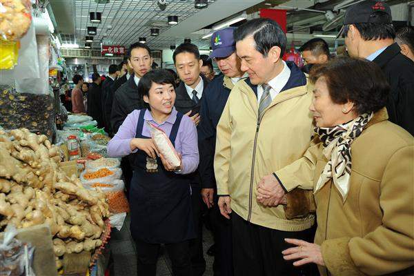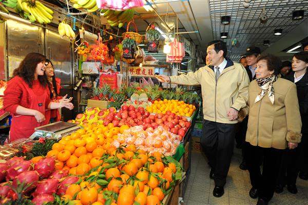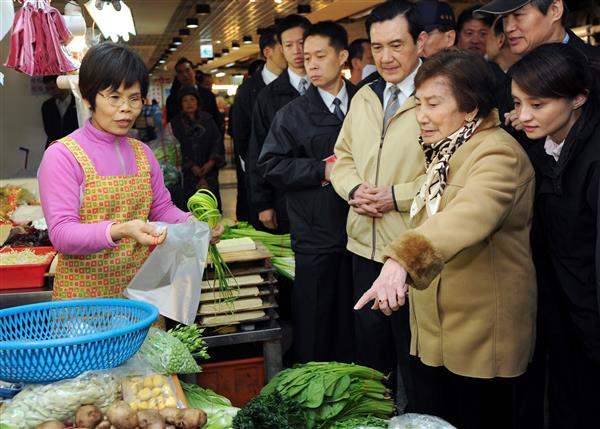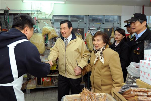 今天是小年夜,馬英九總統一早陪同母親前往臺北市文山區興隆市場採買年節食材,並現場發送春聯、紅包袋,祝福攤商生意興隆、民眾新年如意。