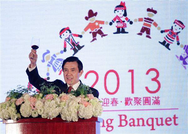 馬英九總統伉儷晚間出席外交部舉辦的「中華民國102年新春聯歡晚會」,總統特別向與會貴賓説明過去幾年我在外交、參與國際社會及改善兩岸關係的成果,並祈願新的一年國家「小龍迎春、景氣升溫、幸福滿門」。