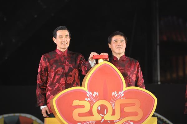 馬英九總統晚間前往圓山花博公園參加「2013臺北燈節」點燈典禮,與臺北市長郝龍斌及與會貴賓等共同按鈕點燈,祝福國人「小龍迎春,幸福滿門」、「小龍迎春,多子多孫」。