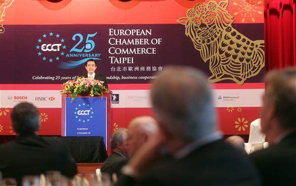 總統以英語致詞時表示,歐洲商會自1988年成立以來,對促進臺灣與歐洲間的經貿投資關係,以及臺灣經濟發展,貢獻良多。回顧該會成立前後,臺灣正發生一連串重要事件,包括1987年政府宣布解除長達38年的戒嚴令,展開國內民主化進程,同時開放國人赴中國大陸探親,引領臺灣進入新的紀元;1988年蔣故總統經國過世,同年年中行政院成立專責機構(行政院大陸委員會前身),負責處理中國大陸相關事務。歐洲商會可謂見證了臺灣的發展過程。
