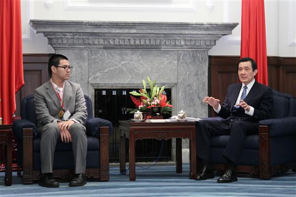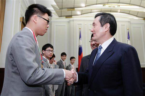 馬英九總統上午接見「2012年第九屆國際國中科學奧林匹亞競賽」我國代表團,對獲獎同學的傑出表現及指導教授們的用心與栽培,表達嘉勉與肯定之意,並期許同學們繼續努力,為國爭光,開拓更美好的前程。