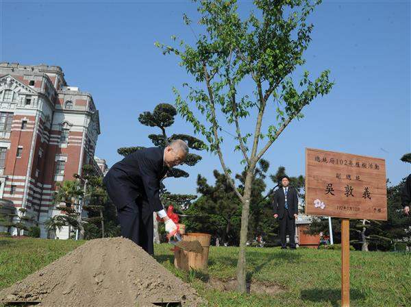 吳敦義副總統上午偕同總統府秘書長楊進添及副秘書長熊光華出席在總統府府前廣場北側庭園所舉辦的「總統府102年植樹活動」,親自種植一株白梅樹,以實際行動宣示政府對環境生態之重視。