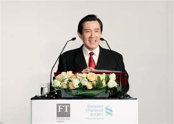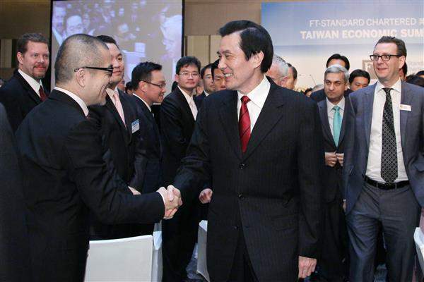 馬英九總統上午前往臺北寒舍艾美酒店出席由英國《金融時報》與渣打銀行共同舉辦的「經濟高峰會-臺灣經濟成長與競爭力」座談會,並說明政府強化國內經濟與產業發展之策略運用及相關成果。