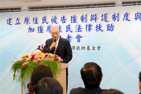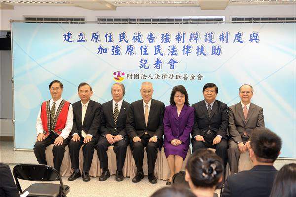 吳敦義副總統下午出席「建立原住民被告強制辯護制度與加強原住民法律扶助」記者會,對「財團法人法律扶助基金會」與政府同心協力擴大保障原住民族的法律權益,獲致具體顯著的改革與進步,表達肯定與嘉許之意。