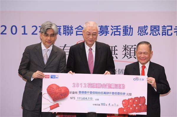 吳敦義副總統下午出席「花旗銀行聯合勸募感恩記者會」,除肯定該公司管理有方、積極承擔社會責任,並籲請更多企業與政府共同努力,為我國弱勢與身心障礙族群創造更完善的社會福利環境。