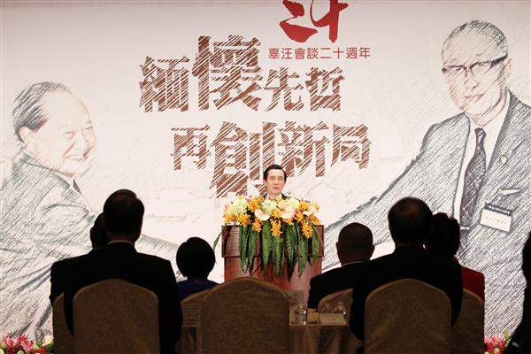 總統致詞時表示,20年前的今日,「海峽交流基金會」辜振甫董事長與「海峽兩岸關係協會」汪道涵會長,秉持「對等協商、互惠雙贏」精神,在新加坡簽署包括《兩岸公證書使用查證協議》、《兩岸掛號函件查詢、補償事宜協議》、《兩會聯繫與會談制度協議》及《辜汪會談共同協議》等四項協議,內容雖多為事務性工作,但該次會談卻是兩岸在民國38年隔海分治後,首度由雙方政府授權的團體所簽署之正式協議,不僅全球關注,亦為兩岸和平樹立不朽的里程碑。