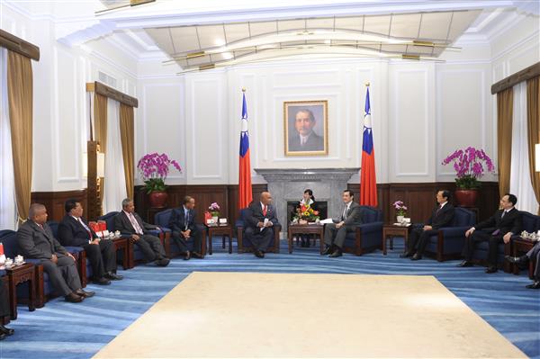 馬英九總統上午接見帛琉共和國眾議院議長安薩賓(Sabino Anastacio)等一行,除代表我政府與人民歡迎訪賓來訪,並期盼進一步擴大雙方合作關係。
