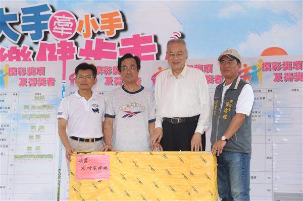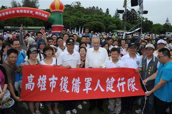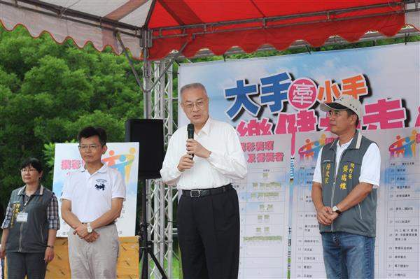 吳敦義副總統上午前往高雄市出席「行政院南服中心大手牽小手快樂健步走」萬人健行活動。 副總統致詞時表示,今日天氣晴朗而不炎熱,非常適合健走,樂見許多爸媽帶著小孩,甚至是三代同堂參與此一有益身心健康的活動,也祝大家身體健康、家庭和樂。 隨後,副總統在行政院政務委員兼南部服務中心主任楊秋興及副執行長劉進添等人陪同下,參觀現場中央與地方政府機關設置的攤位,並與民眾親切互動。