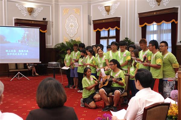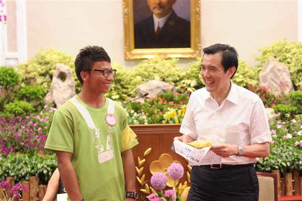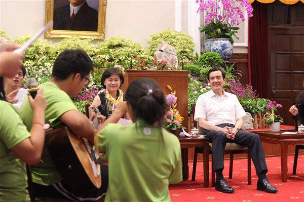 馬英九總統今天中午接見「夢想之鄒」志工團一行,除肯定訪賓藉由徒步環島的方式重新發現臺灣,並期勉渠等持續磨練自己、照顧他人。