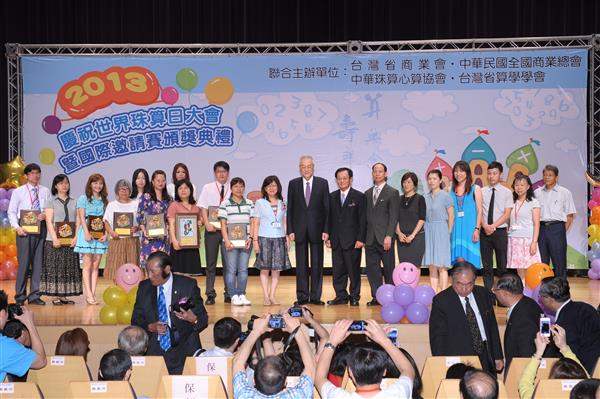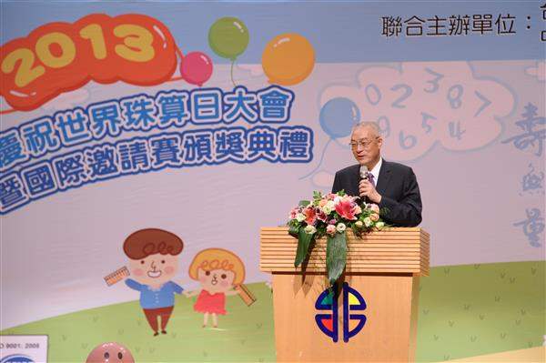 吳敦義副總統下午前往新北市政府,出席「2013年世界珠算日大會暨國際珠心算比賽頒獎典禮」,除肯定珠心算訓練具有啟迪智慧的教育功能,並親頒「最佳貢獻獎」予長期推廣珠心算課程的臺中技術學院楊渠弘教授及臺北市松山家商劉福壽老師。