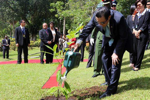 由於聖國植物園係西半球第一座植物園,馬總統一行首先驅車前往參訪。馬總統抵達後,受到現場聖國學童熱情歡迎,繼而在該園區園長夏國棟引導下,於園區內種植一棵蓮霧樹,並參觀首任園長故居。