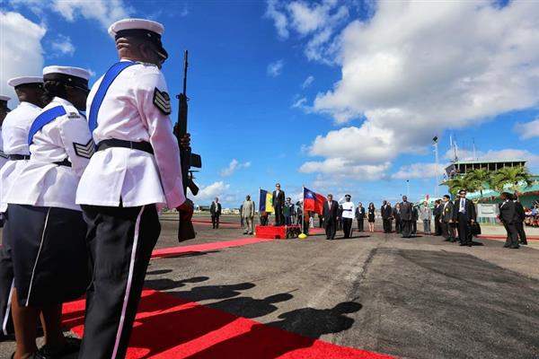 專機停妥後,我駐聖文森大使施文斌及聖國外交部常務次長威廉斯(Nathaniel Williams)登機迎接馬總統下機,聖國總督柏朗泰(Frederick Ballantyne)及總理龔薩福(Ralph E. Gonsalves)則迎於機梯旁;聖國警察樂儀隊並以隆重儀式及21響禮炮,表達對我訪團之誠摯歡迎。