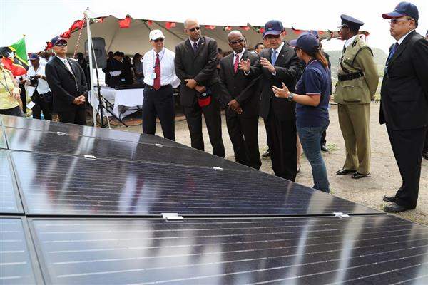 隨後,馬總統一行轉往該國布萊秀(Robert L. Bradshaw, RLB)國際機場旁之太陽能電廠,視察該電廠施工進度,並於聽取承包廠商「宣德能源公司」總經理巨克堅簡報後表示,該電廠預計於下(9)月完工,屆時克國將成為「東加勒比海國家組織(OECS)」中第一個在機場設立太陽能電廠的國家。