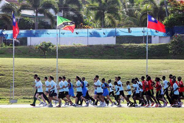 一早,馬總統一行抵達克國Silver Jubilee體育場,由該國衛生暨文化部長萊柏(Marcella Liburd)及體育部長菲利浦(Glenn Philip)等陪同,與該國國家青少年跑步選手慢跑。