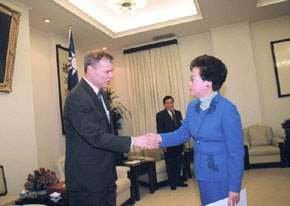 卜睿哲理事主席下午是由外交部次長吳子丹陪同,到總統府晉見副總統,美國在台協會台北辦事處代處長蘇佩秋(Pamela Slutz)也在座。