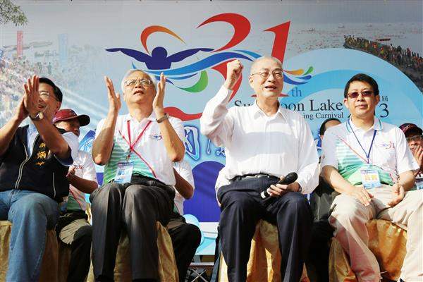 吳敦義副總統上午在教育部長蔣偉寧、體育署副署長王水文及南投縣代理縣長陳志清等人陪同下,先至日月潭水社碼頭參加「總統魚」放流活動,象徵水庫生態源源不息、永續長存;隨後至朝霧碼頭出席「2013日月潭國際萬人泳渡」開幕典禮。