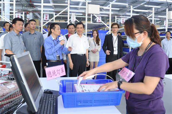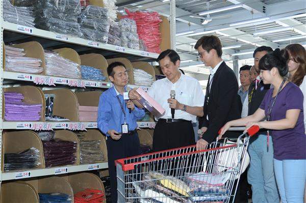 總統抵達後,首先由該公司董事長鄭景太及品牌總監周品均陪同,參觀物流中心,瞭解服飾進貨驗收、電子揀貨及包裝檢查等流程,對於該公司建置「e-tag電子撿貨」作業系統,有效縮短出貨時間,總統也表達高度興趣,並親自體驗運用該系統取得先前上網訂購之休閒衫。