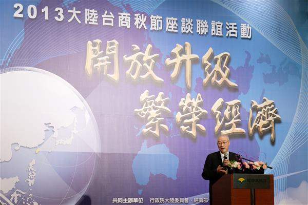 吳敦義副總統晚間前往臺中市福容大飯店出席「2013大陸臺商秋節座談聯誼活動」晚宴,說明政府保障臺商投資權益之作為。