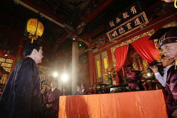 總統抵達後由「正獻官」臺北市長郝龍斌等陪同,在引贊禮生引導下,至大成殿孔子神位前上香並行三鞠躬禮,繼由樂生演奏上香禮樂,儀式莊嚴隆重。