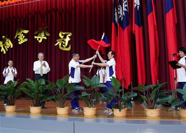 副總統抵達左營「國家運動訓練選手中心」會場後,分別將國旗與會旗授與代表團團長—中華奧會主席蔡辰威及總領隊—中華奧會副榮譽副主席陳建平,並頒贈加菜金給代表團。