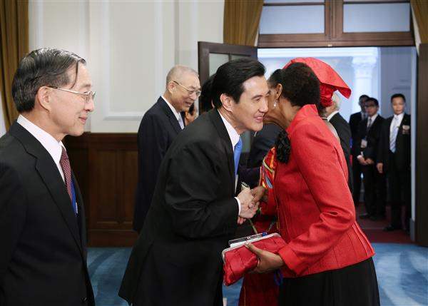包括帛琉總統雷蒙傑索(Tommy Remengesau Jr.)、索羅門群島總理里諾(Gordon Darcy Lilo)伉儷、甘比亞副總統賈莎迪(Isatou Njie-Saidy)、布吉納法索國會議長瓦桑羅(Soungalo Appolinaire Ouattara)伉儷、尼加拉瓜外交部長桑多士(Samuel Santos Lόpez)等在內約250名外賓,上午9時30分到總統府參加致賀活動,馬總統伉儷與吳副總統伉儷親切地與前來致賀的外賓們一一握手致意答謝。總統府秘書長楊進添、外交部長林永樂在場陪同。