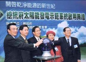 陳總統水扁先生今天上午在經濟部林信義部長陪同下,於總統府北苑參加「總統府太陽能發電示範系統啟用典禮」,並為這套系統啟動按鈕。這套架設在總統府的太陽能發電系統,裝置容量為一萬瓦,估計每天可提供三十度的電力,做為府內迴廊照明之用,而台灣也成為世界上第一個於總統府裝設太陽能發電示範系統的國家。