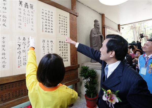 馬英九總統下午前往臺中市西屯區出席永安國小書法成果展,除肯定該校積極推廣書法教育之貢獻,亦期許教育部及民間單位共同努力,持續發揚該項技藝。