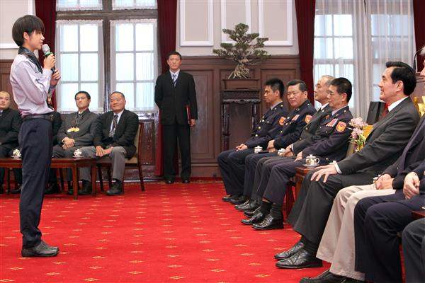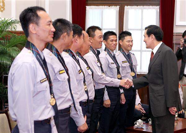 馬英九總統上午接見「2013年第15屆世界警察消防運動會」中華代表隊一行,對渠等於國際賽事中勇奪佳績,締造我國自參賽以來最佳獲獎紀錄,表達肯定與祝賀之意。