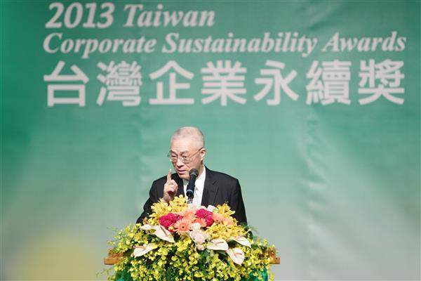 吳敦義副總統上午出席「2013臺灣企業永續獎」頒獎典禮,除肯定得獎企業實踐永續經營的付出,並期勉各界與政府共同為維護臺灣及全球的環境而努力。