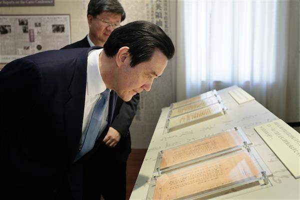 總統抵達後,首先參觀舘內陳列之特展作品,包括「開羅會議」紀錄片、《開羅宣言》原稿、中國戰區臺灣省受降典禮簽名錄及相關新聞報導等,並於致詞時表示,今天是《開羅宣言》發表70週年紀念日,亦為我政府要求日本於二次戰後返還臺澎予中華民國之70週年,對於能獲邀出席此一盛會,深感榮幸。