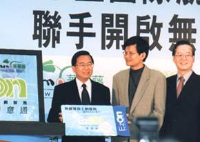 跨國界的通訊與傳播,無疑是知識經濟中在各國經濟產值最大、活力最強的產業,我國對於這篇科技產業新頁章的參與企圖,不容置疑。讓自己走向世界,把世界變成自己,是這張無線網路卡的最高價值,是你我必然的行為趨勢,也是台灣在這波產業的新希望。阿扁也要藉此機會,向台灣所有為此打拼的網路、電信夥伴,表達肯定與謝意,我們當攜手努力充實「綠色矽島」應有的實力,以達到民間、政府、使用者的三贏局面。最後祝福各位新年順利、心想事成。