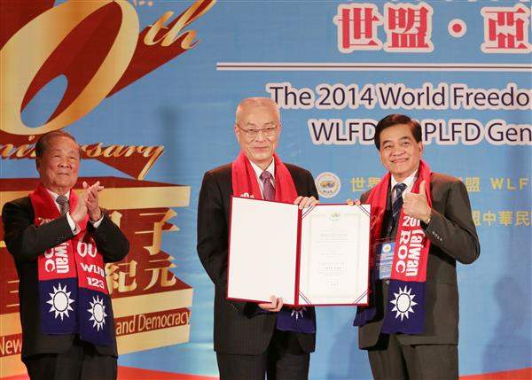 吳敦義副總統下午前往臺北圓山飯店,出席「2014世界自由日慶祝大會暨世亞盟年會」,代表我國政府與人民歡迎全球愛護自由民主人士齊聚中華民國,並期盼自由永續、民主發光。
