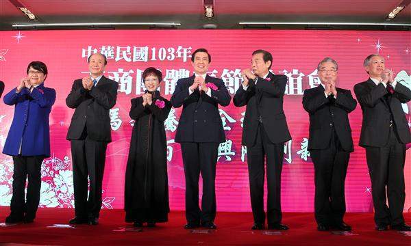 馬英九總統晚間前往臺北國際會議中心出席「103年工商團體春節聯誼會」,除與國內各大工商團體互賀新禧,並說明政府推動貿易自由化之決心與成果。