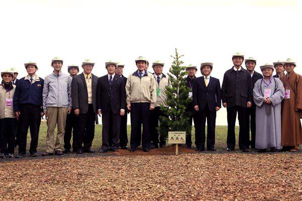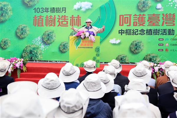馬英九總統上午前往新北市金山區財團法人法鼓學校校區,出席「植樹造林 呵護臺灣」民國103年中樞紀念植樹活動,並說明政府在「節能減碳」工作上之努力已有具體成效。