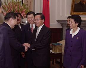 陳總統水扁先生今天上午接見北美洲台灣商會聯合總會返台訪問團,對僑胞們以具體行動支持政府表達歡迎與肯定之意。